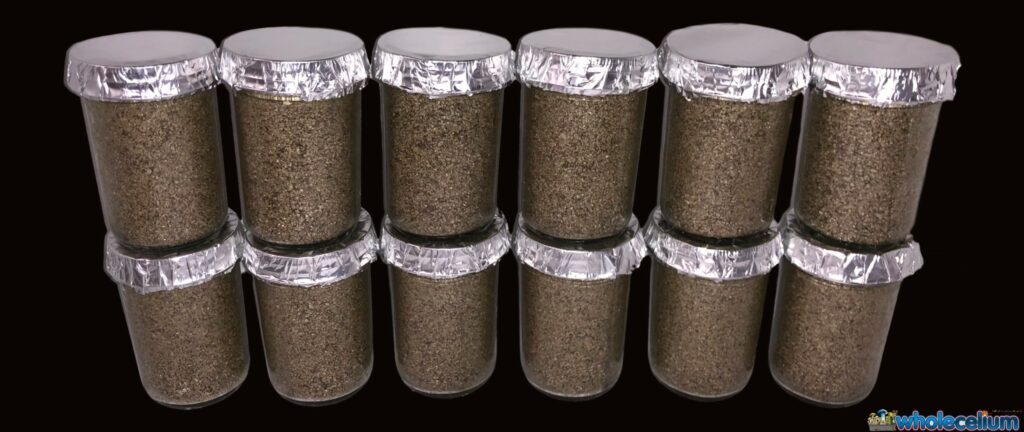 - Når vermiculitten er våd, tilsættes hurtigt den nødvendige mængde brun rismel. Bland det grundigt. Målet er, at vermiculitten skal være helt dækket af melet. Det betyder, at hver eneste del af dit substrat vil være frugtbart for sporerne.